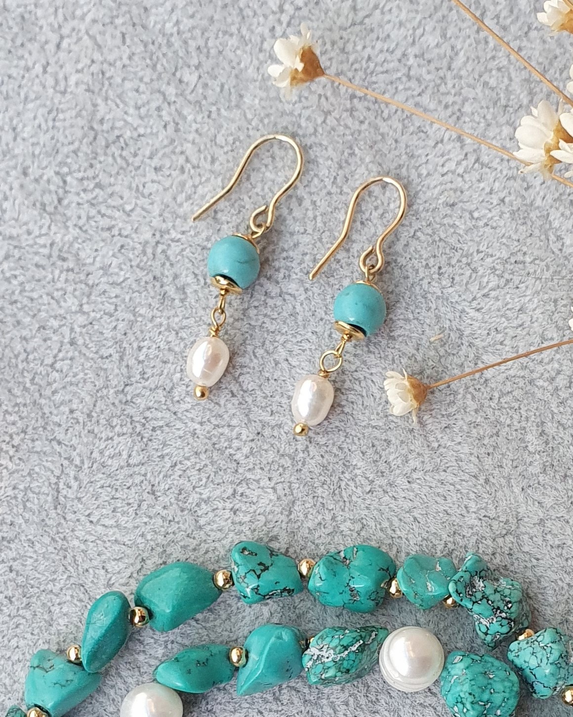 Um brinco que traduz leveza e sofisticação em cada detalhe. Esta joia delicada combina a Howlita Turquesa natural, conhecida por suas propriedades calmantes, com o brilho sutil da Pérola Natural, símbolo eterno de elegância e feminilidade.⠀