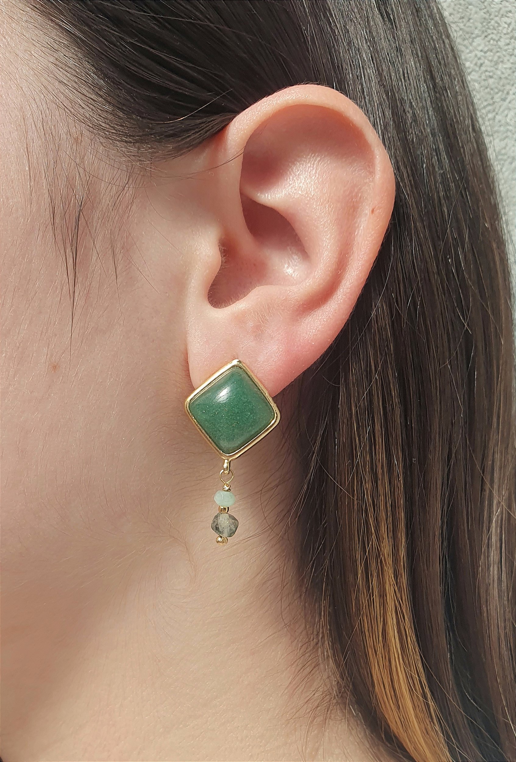 Um brinco que traduz sofisticação em cada detalhe. Com base de Quartzo Verde Natural, esta peça é finalizada com um delicado pêndulo de duas pedras naturais, criando um movimento sutil e encantador.