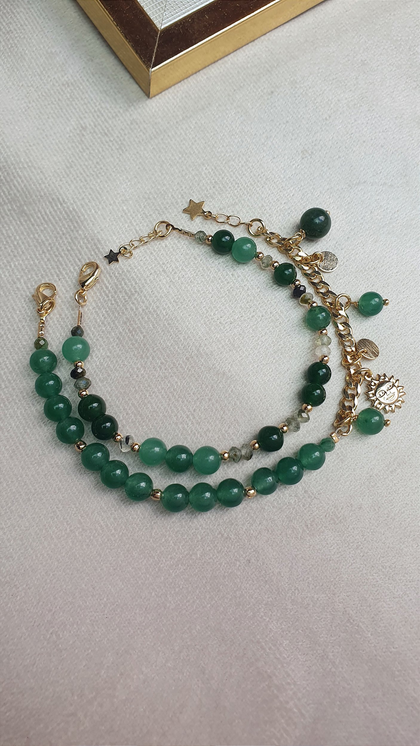 A Pulseira Brillia é a expressão perfeita de elegância e luminosidade. Confeccionada com pedras naturais de jade verde, ela ganha ainda mais destaque com sua corrente banhada a ouro 18k e um delicado pingente de sol, também banhado a ouro 18k, que simboliza vitalidade e luz interior. Uma joia versátil e sofisticada, ideal para composições modernas e atemporais.