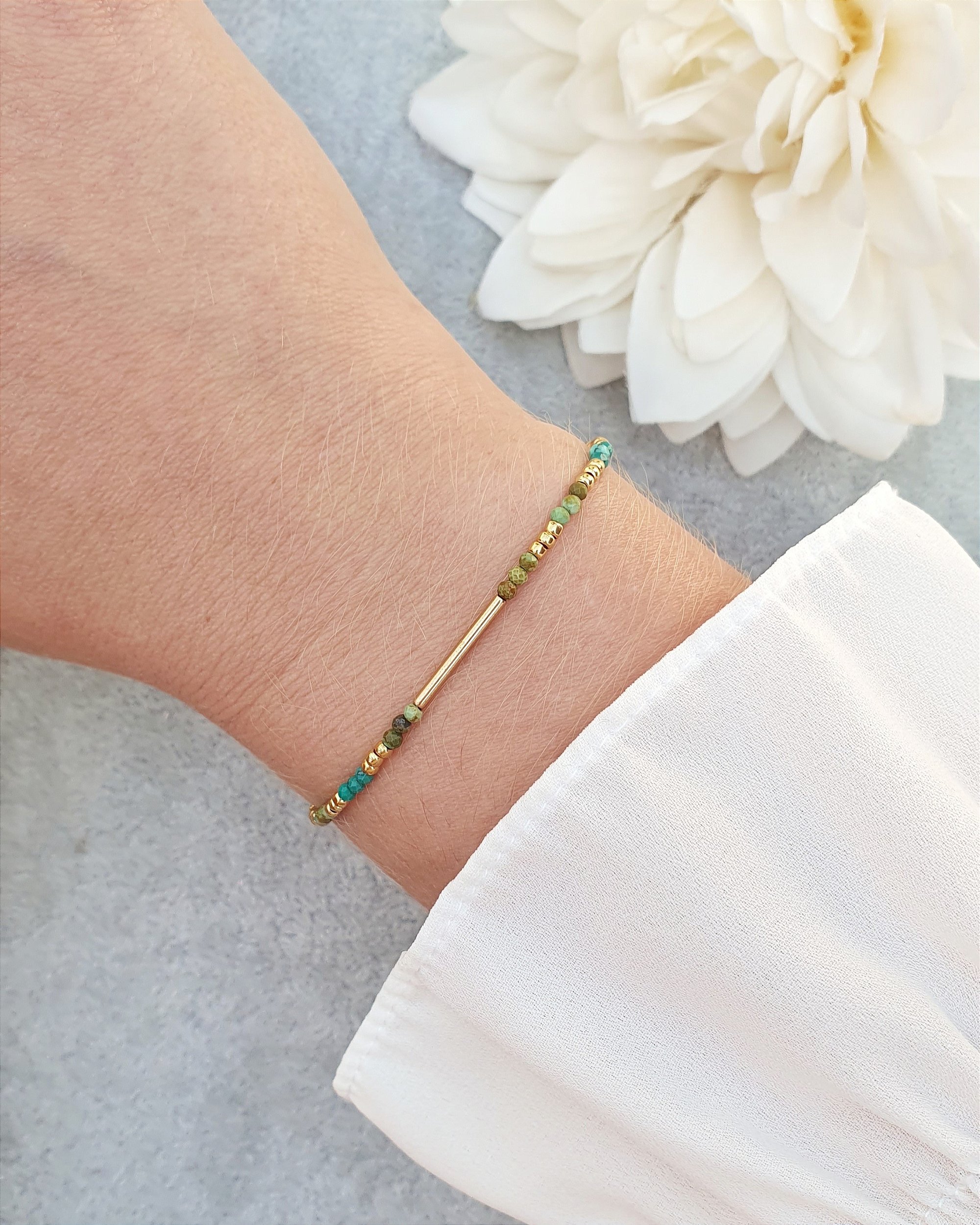 Elegante e minimalista, esta pulseira apresenta a beleza única da turquesa australiana em tons esverdeados e azulados, intercalada com delicadas esferas douradas.