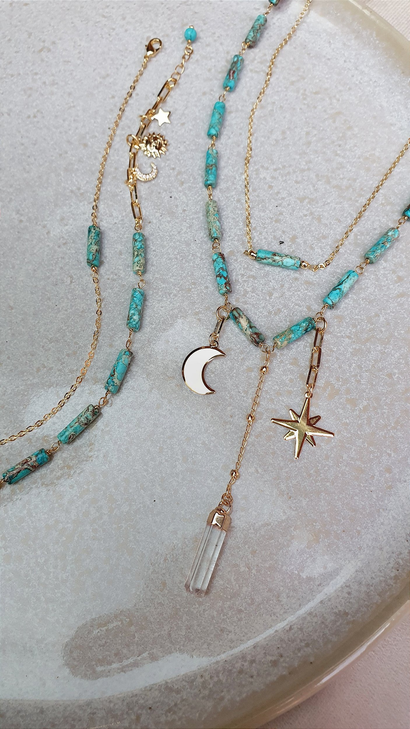 A Pulseira Estelar traduz a beleza do firmamento em uma joia única. Confeccionada com pedras naturais de jaspe azul, sua montagem delicada é enriquecida pelo acabamento banhado a ouro 18k e por uma charmosa corrente que carrega três símbolos celestiais: uma lua cravejada, um sol e uma estrela. Uma peça sofisticada que une design encantador e significado atemporal.