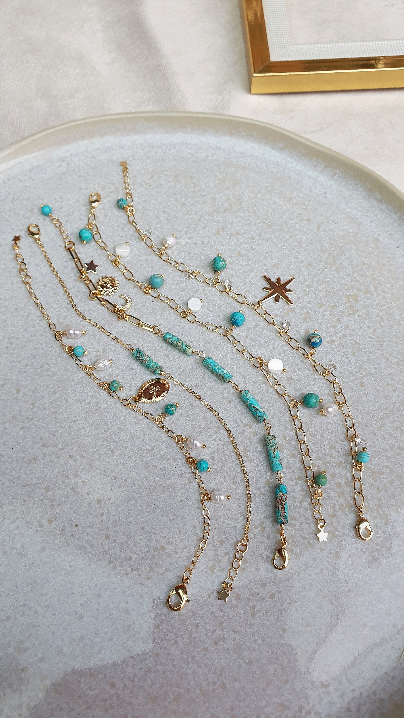 Inspirada na estrela que guia os caminhos, a Pulseira Polaris é uma peça delicada e cheia de significado. Confeccionada em corrente banhada a ouro 18k, é adornada com elegantes pingentes de jaspe turquesa e pérolas naturais, além de um encantador pingente de estrela-guia que simboliza direção e propósito. Uma joia sofisticada que une beleza, elegância e simbolismo em cada detalhe.